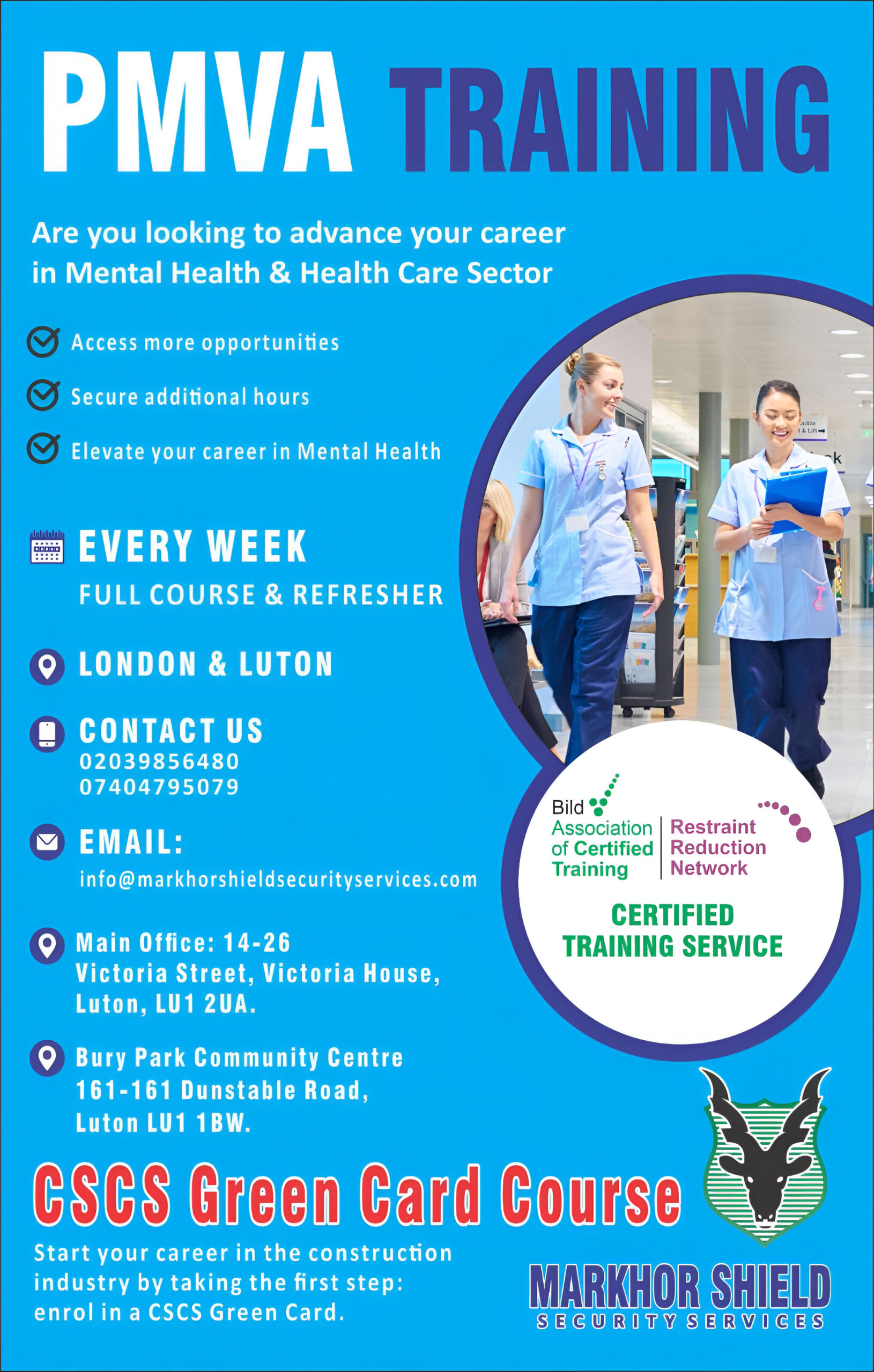 Markhor Shield Security Services is proud to offer PMVA (Prevention and Management of Violence & Aggression) Training and the CSCS Green Card Course in London and Luton.